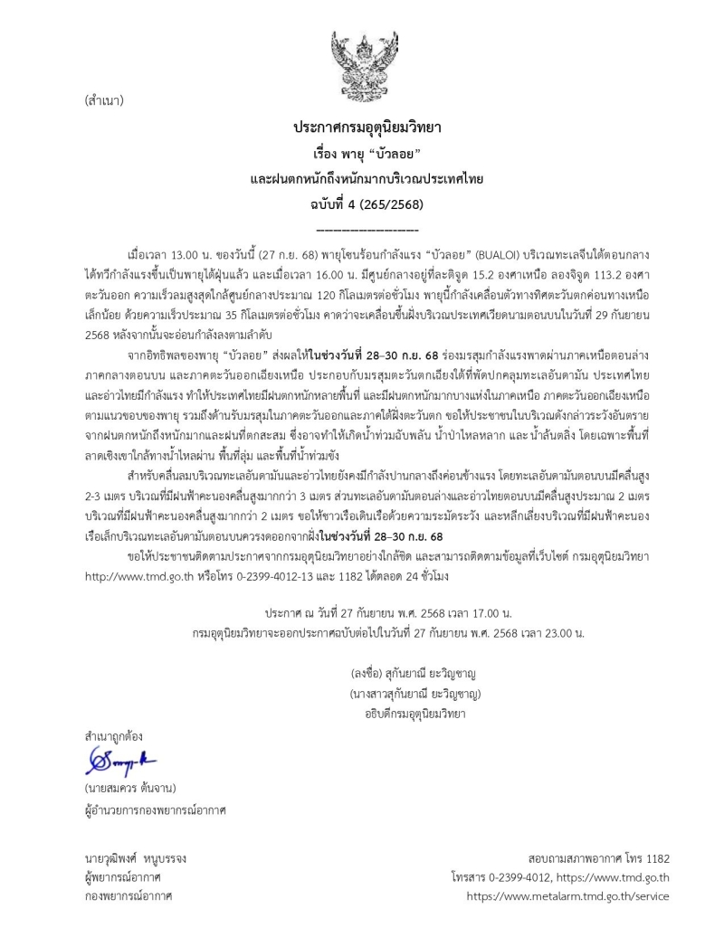 วันที่ 27 ก.ย. 68 กรมอุตุนิยมวิทยา ประกาศเรื่อง พายุ บัวลอย และฝนตกหนักถึงหนักมากบริเวณประเทศไทย ฉบับที่ 4 (265/2568) เมื่อเวลา 13.00 น. ของวันนี้ (27 ก.ย. 68) พายุโซนร้อนกำลังแรง บัวลอย (BUALOI) บริเวณทะเลจีนใต้ตอนกลางได้ทวีกำลังแรงขึ้นเป็นพายุไต้ฝุ่นแล้ว และเมื่อเวลา 16.00 น. มีศูนย์กลางอยู่ที่ละติจูด 15.2 องศาเหนือ ลองจิจูด 113.2 องศาตะวันออก ความเร็วลมสูงสุดใกล้ศูนย์กลางประมาณ 120 กิโลเมตรต่อชั่วโมง