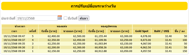 ราคาทองคำ วันที่ 19 พฤศจิกายน 2568